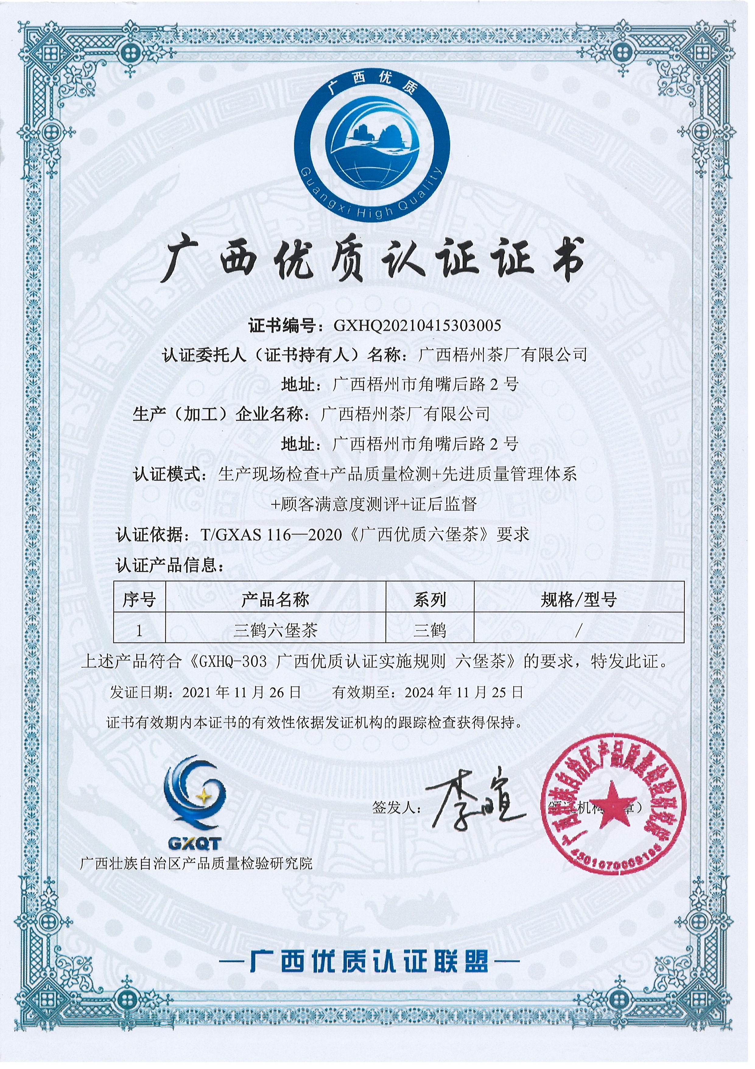 廣西梧州茶廠有限公司獲得廣西優(yōu)質(zhì)認(rèn)證證書(shū)