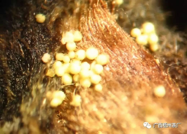 “金花”是在獨(dú)特的環(huán)境下,生長(zhǎng)出來(lái)的一種益生菌類(lèi),又名“冠突散囊菌”。肉眼看上去,呈金黃色小顆粒狀。金花茂盛的六堡茶,催化多酚類(lèi)化合物氧化,使茶葉苦澀味減少,茶葉品質(zhì)更醇甜,有著濃郁的菌花香,口感更順滑…