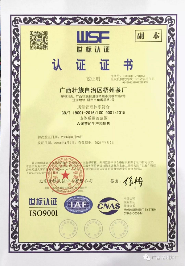 快訊 | 梧州茶廠獲得新版質(zhì)量管理體系認(rèn)證證書