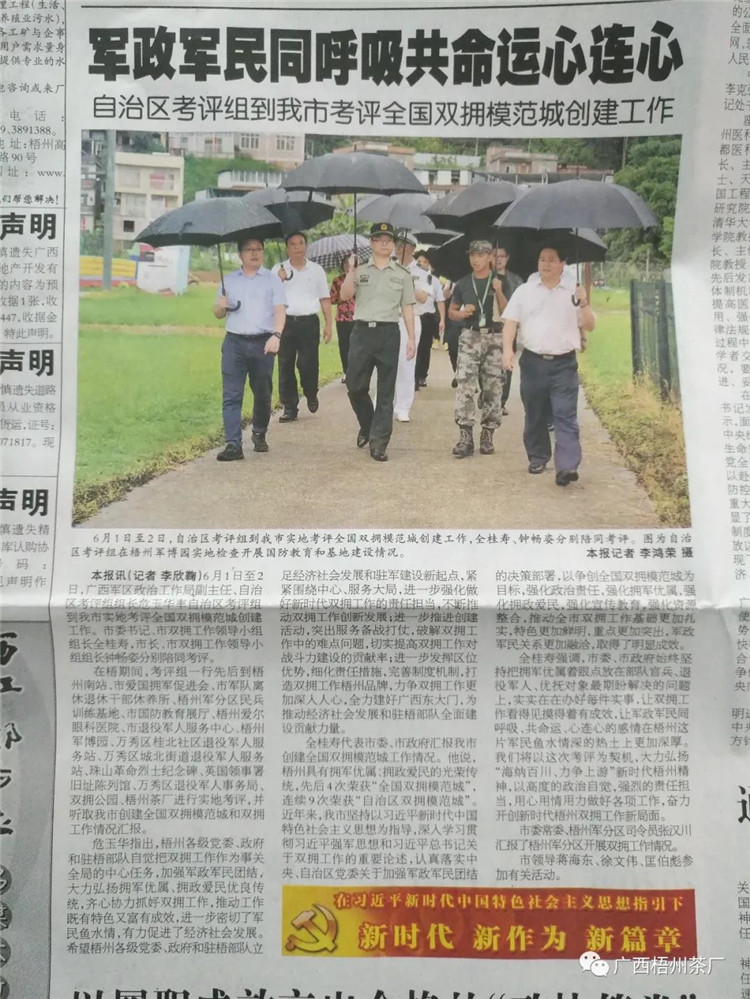 2020年6月2日下午,廣西軍區(qū)政治工作局副主任危玉華率自治區(qū)考評組到廣西梧州茶廠實(shí)地考評"全國雙擁模范城"創(chuàng)建工作,對梧州茶廠"情系老兵 真誠服務(wù)",關(guān)愛退役員工的做法給予肯定。梧州市委書記全桂壽、市長鐘暢姿等陪同考評。